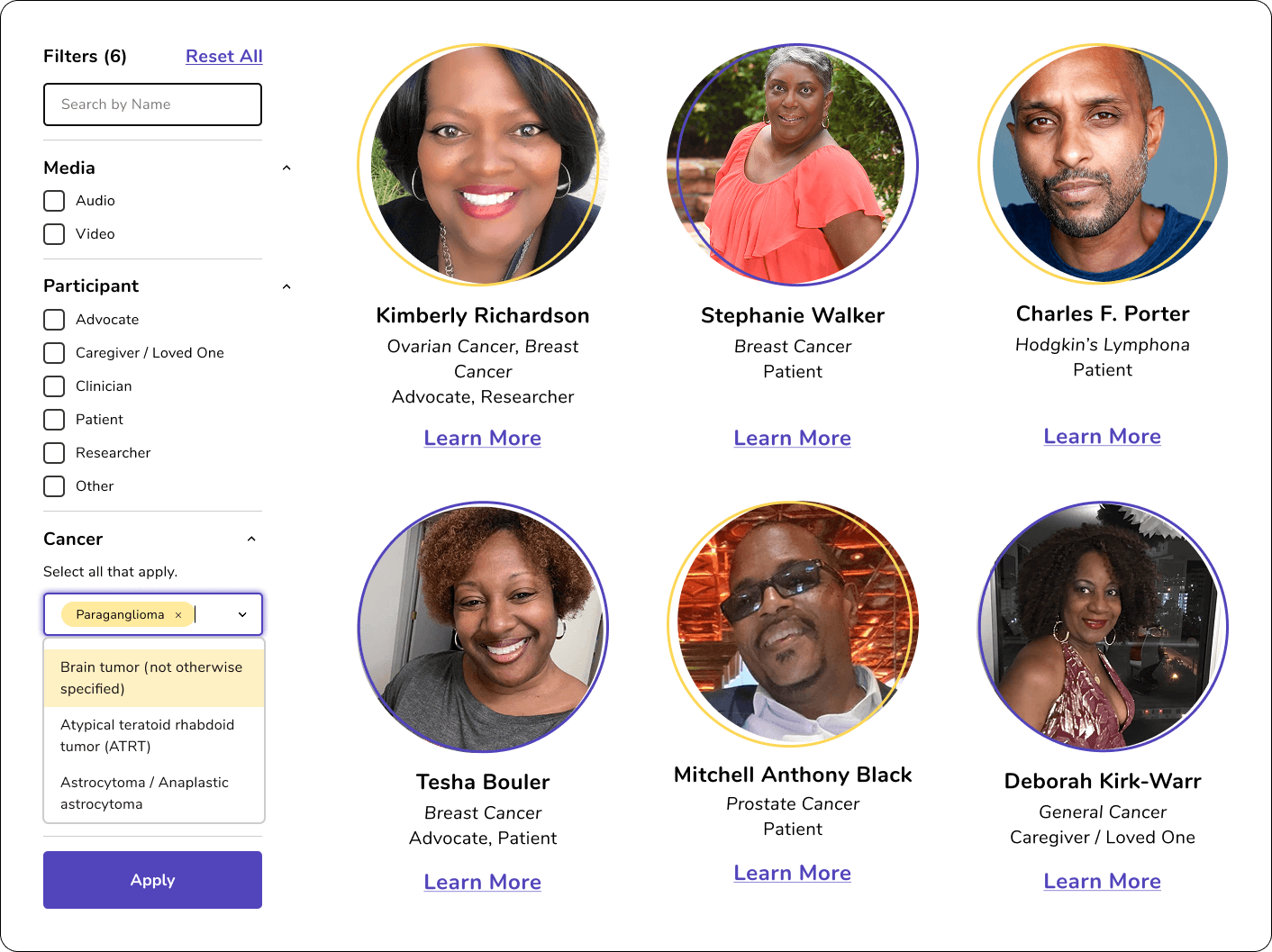 A detailed filtering system showcasing different cancer types and the participants involved was created to allow the filtering of a vast amount of content.