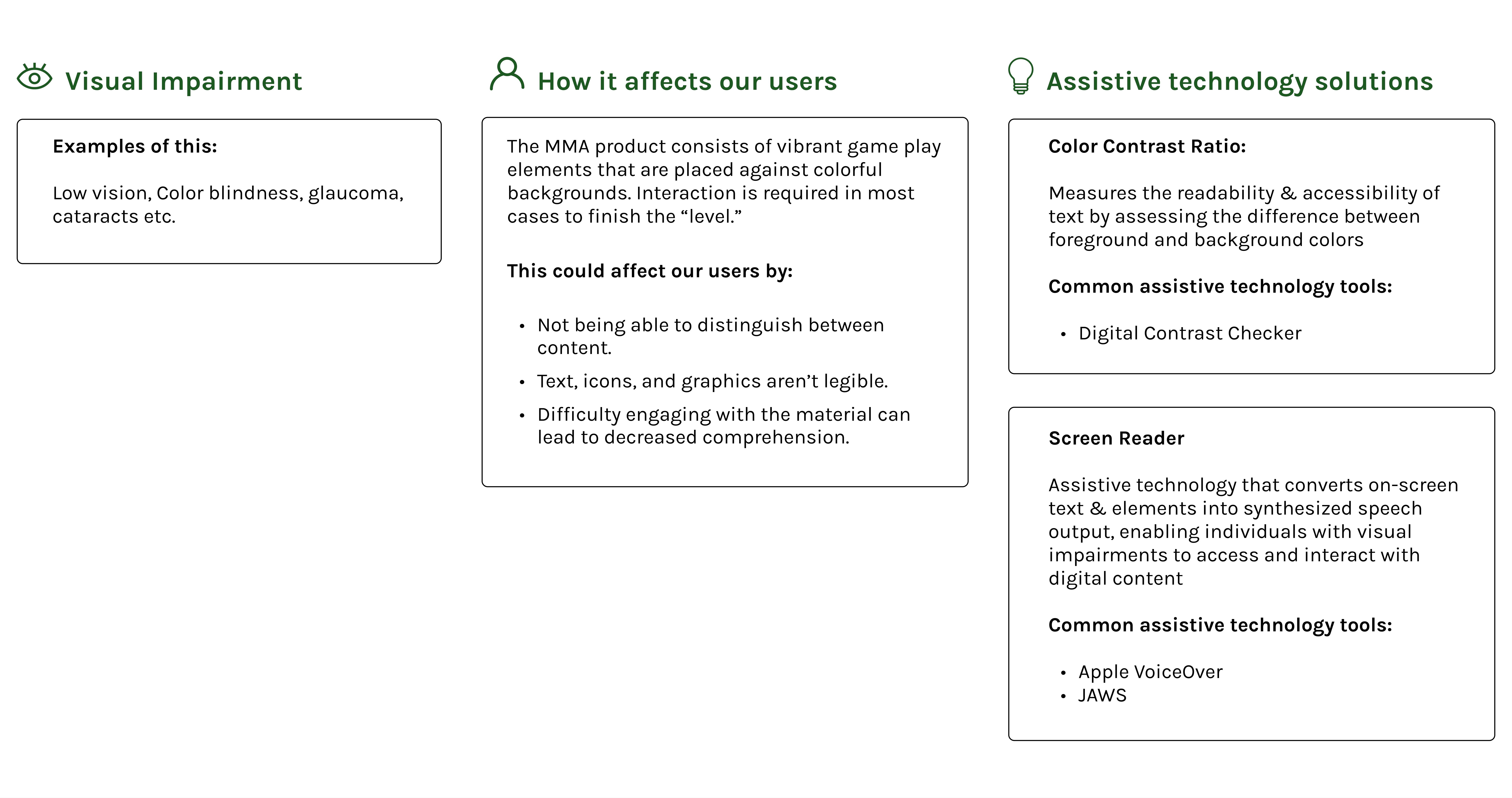 MMA’s content ecosystem had grown rapidly, but accessibility standards had not scaled with it. As a result, inconsistencies across their 30+ games, interactive modules, UI patterns, and instructional components created barriers for learners with diverse cognitive, visual, and motor needs.