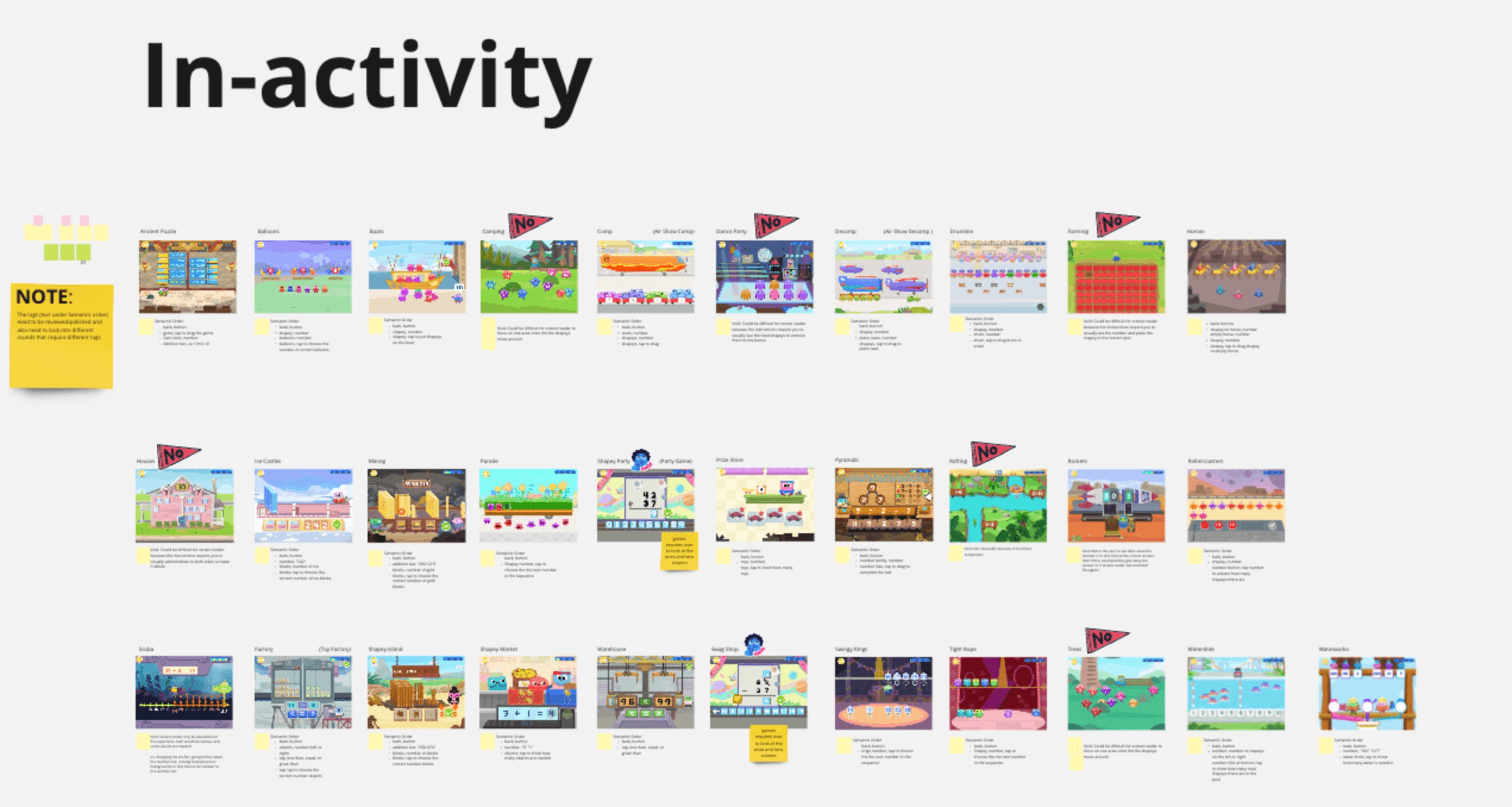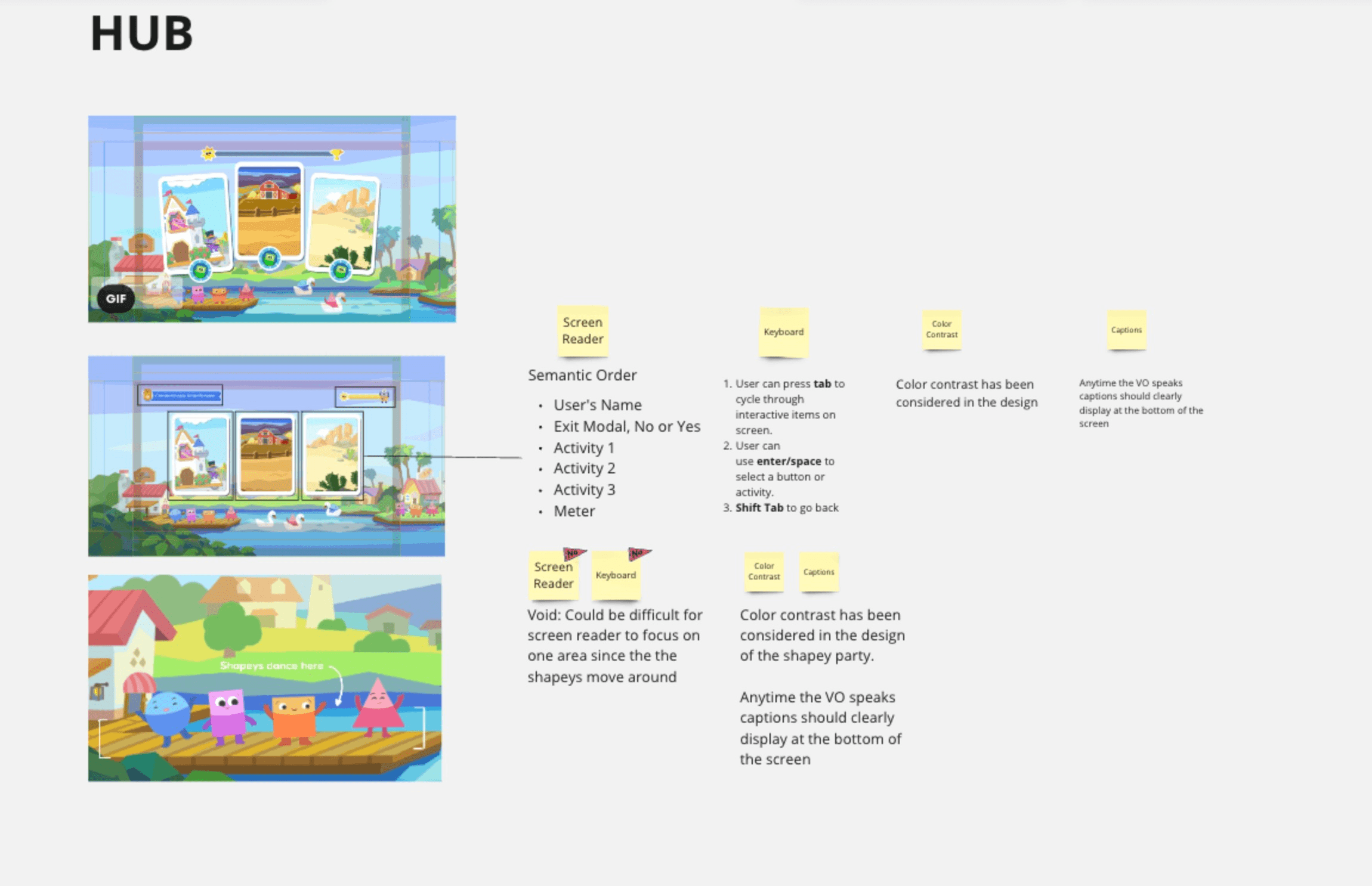 I was tasked to lead initial accessibility efforts to correct the not supported requirements found in the audit. My approach included research, strategy, and an accessibility assessment of 30+ game activities. I worked closely with product managers and developers to provide scalable and efficient solutions.