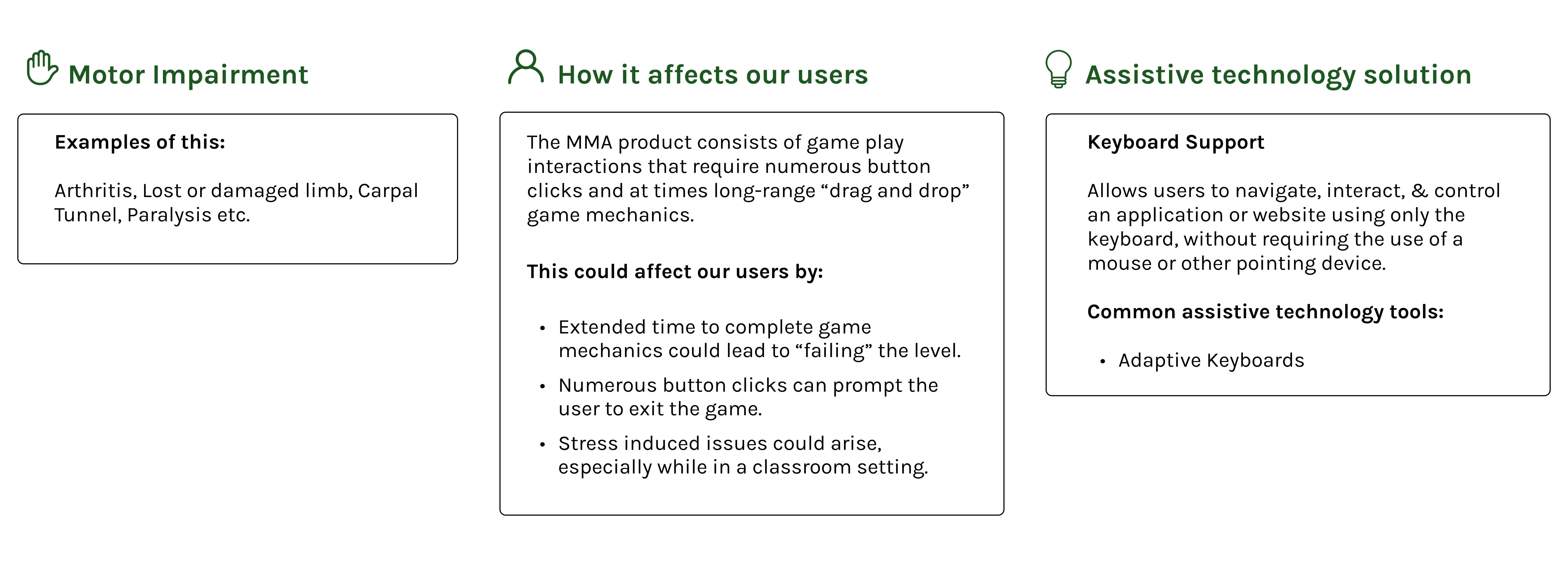 I conducted a structured review of visual, cognitive, motor, and auditory impairments, mapping each to potential friction points within our game-based learning environment. This allowed me to identify where our experience could unintentionally exclude users and prioritize systemic improvements over isolated adjustments.