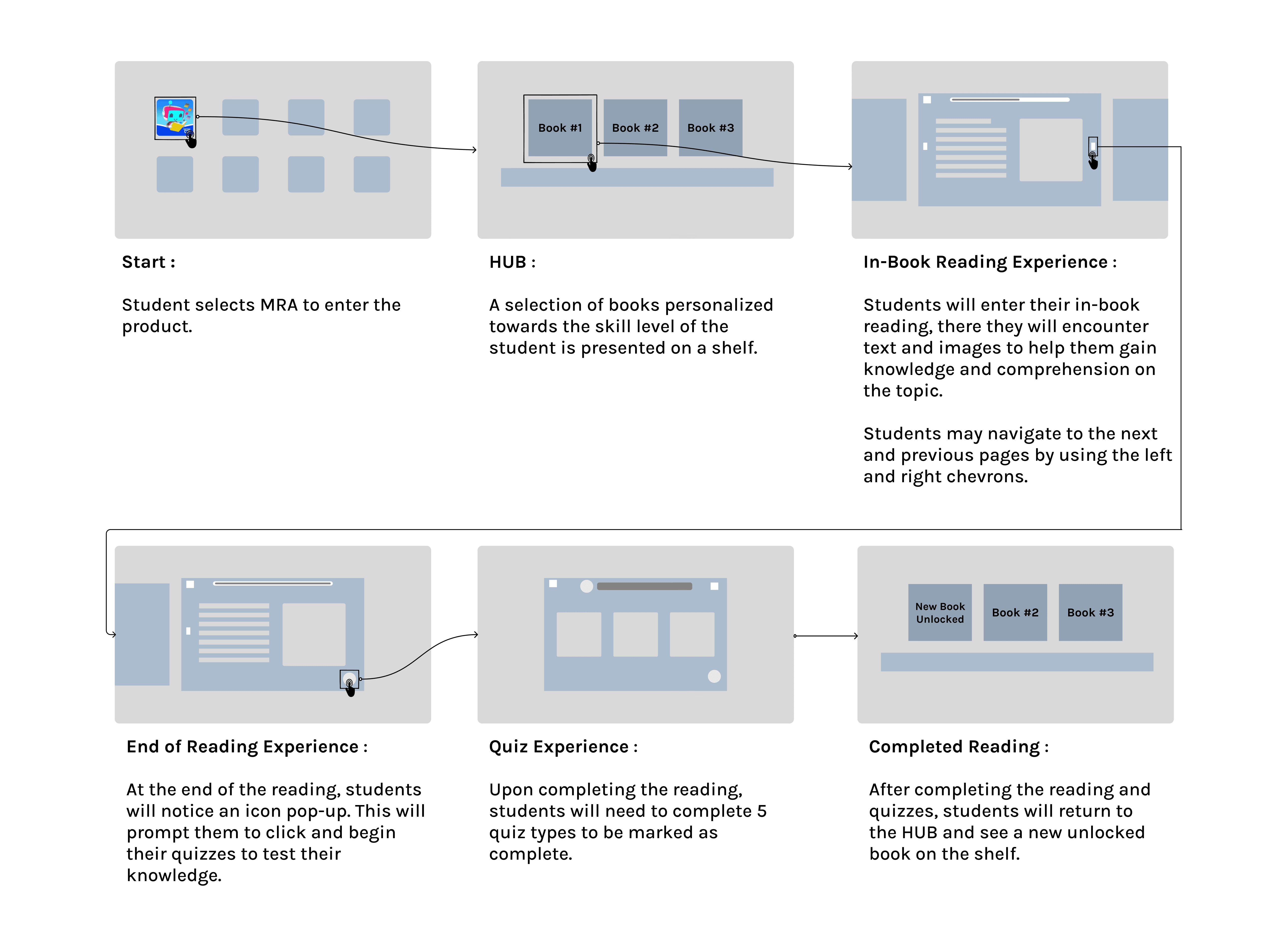 I made an user flow to better visualize the process of beginning and completing a book. This helped me gain more insight on the student’s perspective, determine next steps during the experience , and gain insight on how to support them on completing their goals.